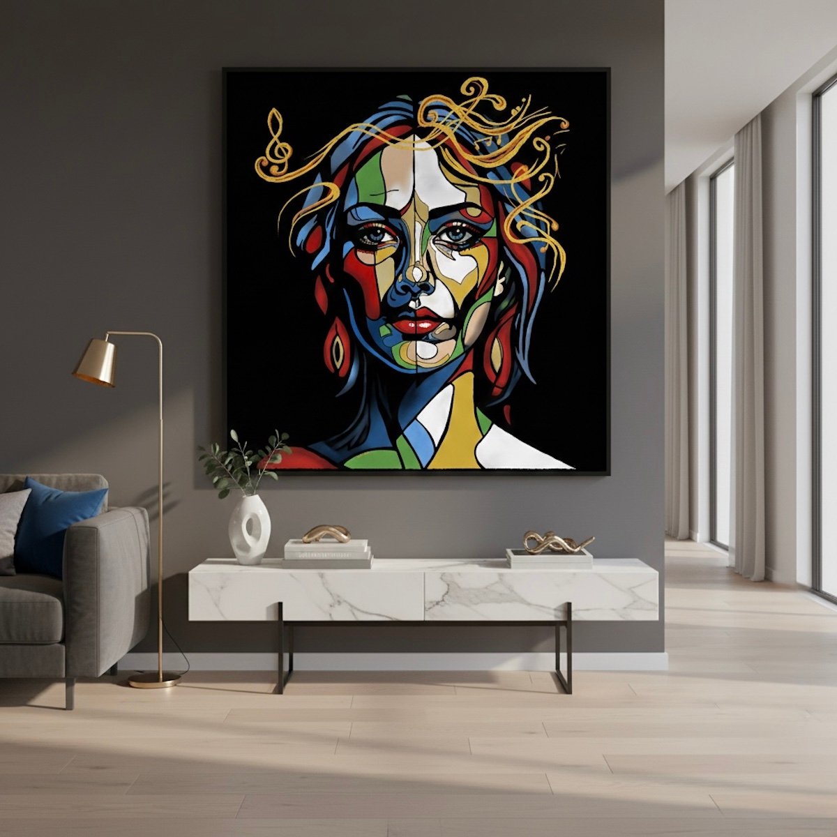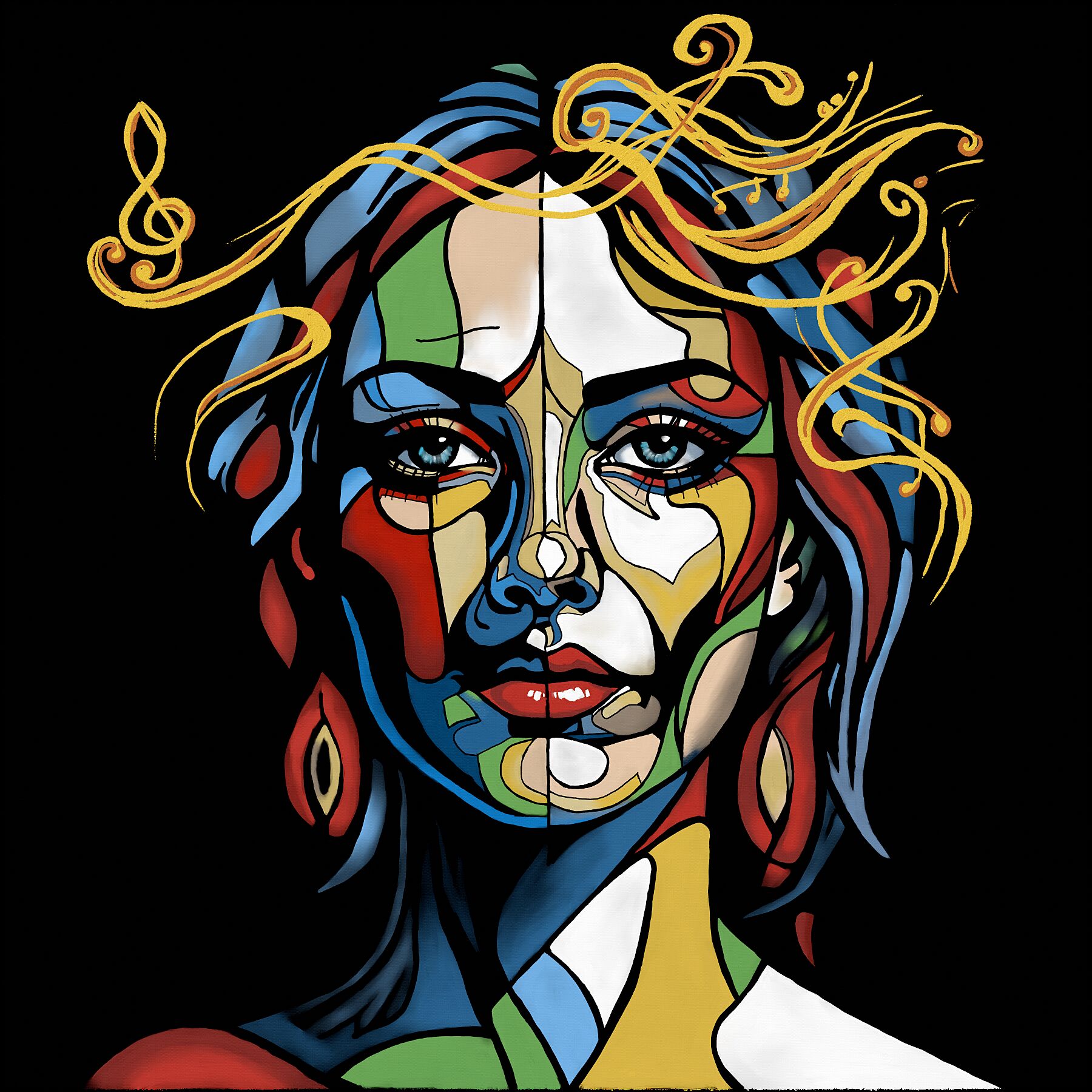 Experience the visual rhythm of "Harmonic Vision," a masterpiece that celebrates the intersection of sound and soul. This vibrant work of hand-finished digital art deconstructs the traditional portrait into a symphony of geometric color and lyrical movement. Featuring integrated musical clefs and swirling melodic lines, it is an essential acquisition for those who find inspiration in the harmony between the visual and the auditory.